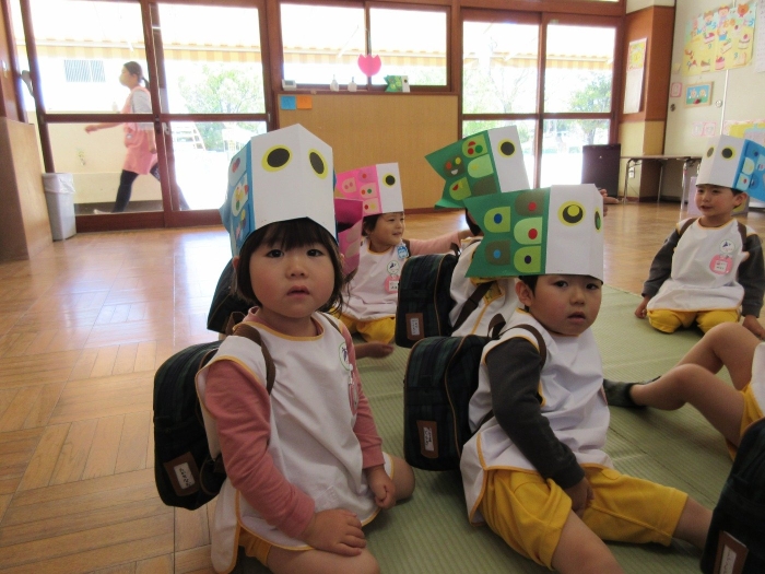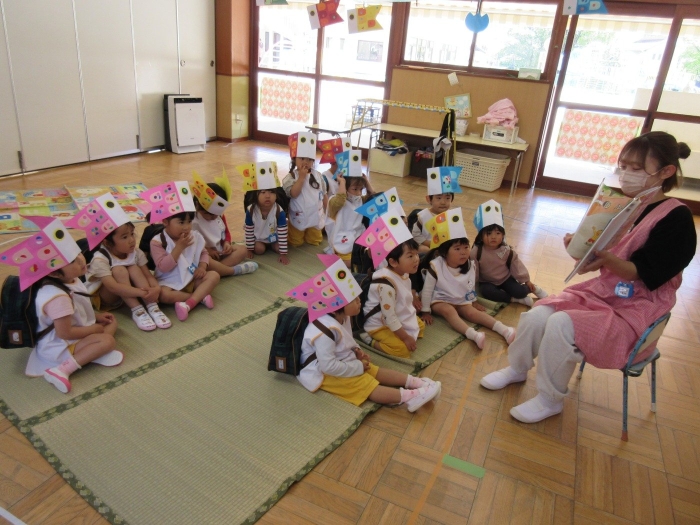 最後には、年少さんで初めて製作をしたこいのぼりの帽子を被って「こいのぼり」を歌いました♪