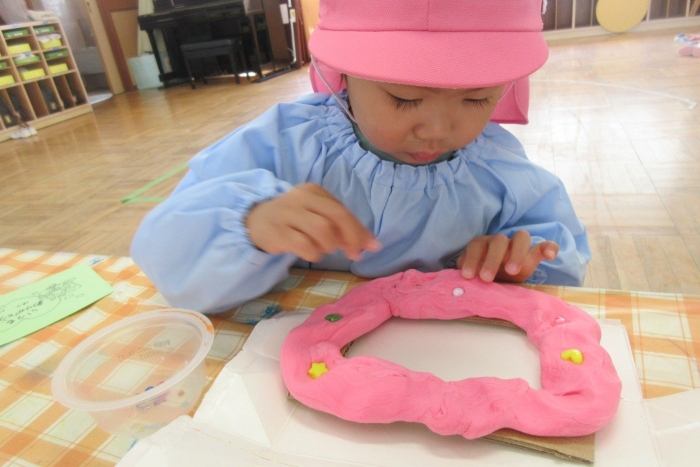 指を入れて顔を作ったり、ビヨ~ンと長く伸ばしてみたりして感触を楽しみながら力いっぱいこねました💪