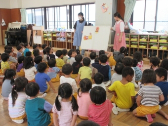 お誕生日の子は、みんなの前に立つことに緊張気味の様子でしたが、自分のクラスと名前、インタビューに笑顔で答えることができました♡インタビューの後にはみんなから♪ハッピーバースデーの歌のプレゼントを贈り、先生からのプレゼントでアンパンマンのパネルシアターを見ました!「牛乳!」「いちご!」と夢中でクイズに答えてくれましたよ!!