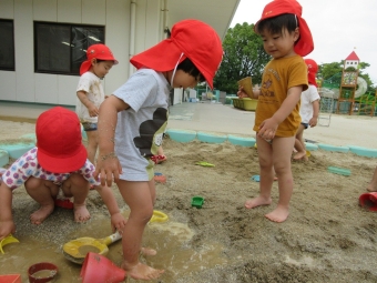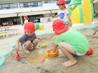 天気のいい日には水遊びや泥んこ遊び、色水遊びをして楽しんでいるうさぎぐみさん🐰