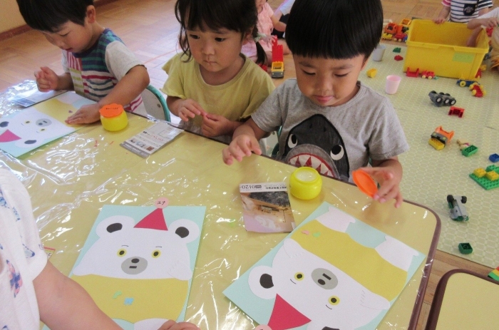 6月の毎日製作は『しろくまのパンツ』をテーマにのりの扱い方を練習しました🐻