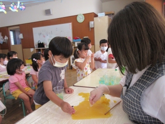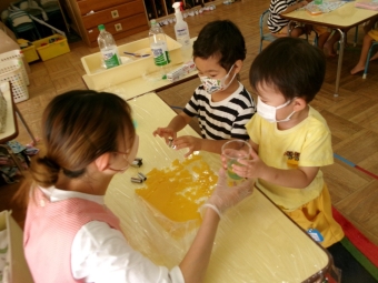 青くきれいに光ったコップの中に、フルーツとお星さまの寒天を浮べました✨「きれいな青色だ~!」「おいしそうだね!!」と楽しくおいしく作ることが出来ました😊