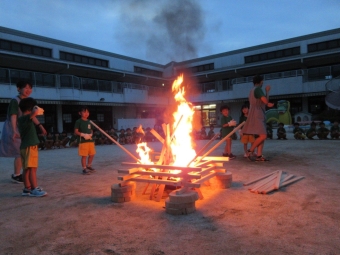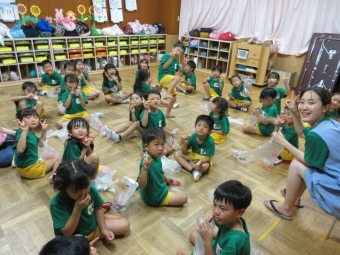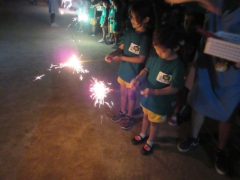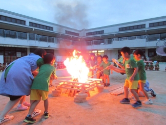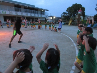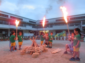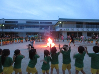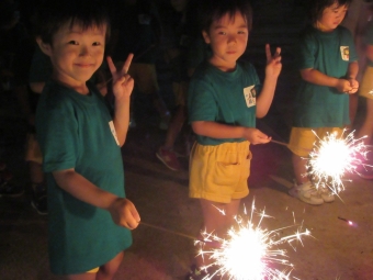 幼稚園に戻ってからは、プールに入って水遊びをしました!地引網やビーチランドで遊んで火照った体に、「きもち~!」と大興奮の子どもたちでした😊🌊夜ご飯は、前日みんなで切った野菜が入ったカレー🍛をおいしくいただきました♪そして、日が暮れてくると・・・お楽しみのキャンプファイヤーの時間です🔥お友だちや先生と火を囲んで、歌を歌ったりゲームをして楽しみました✨他にも、先生の出し物を観たり花火をしたりと、夜の園庭ですてきな時間を過ごすことができました🌟幼稚園に戻ってから就寝までの様子をご覧ください💚