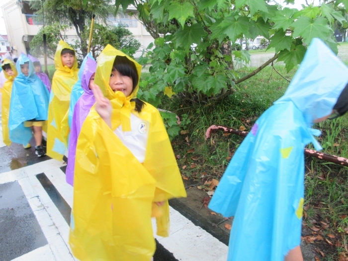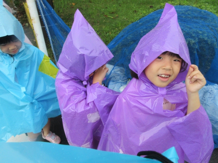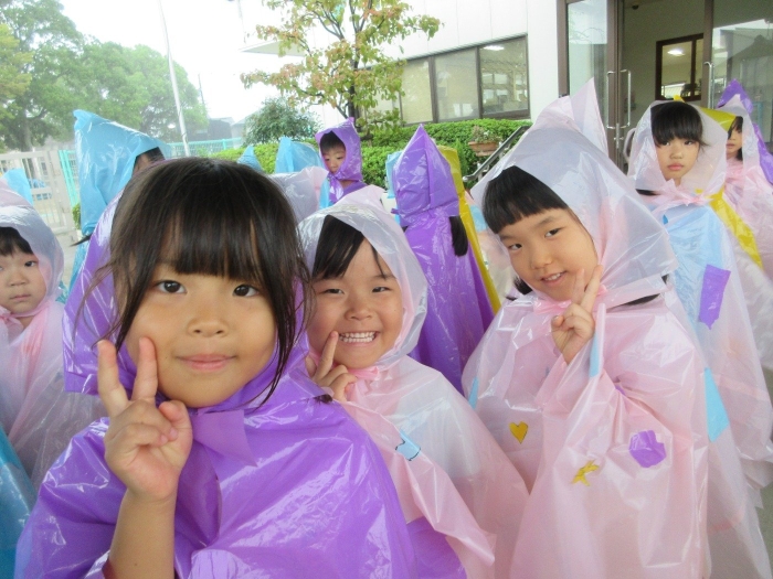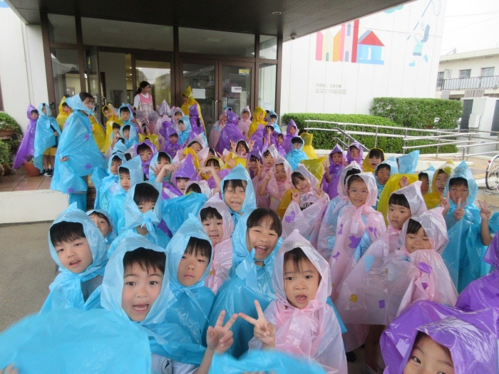 年長は、夏休み前に作ったカッパを着て、恐竜公園までお出掛けすることにしました🎵
