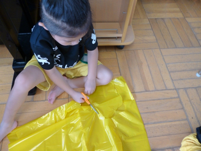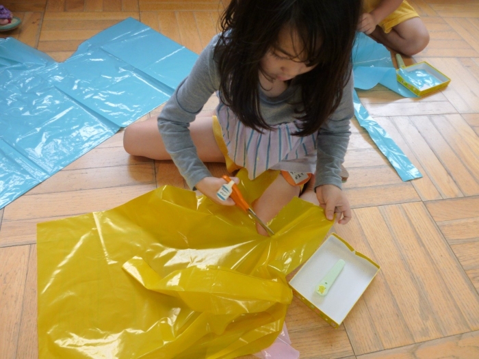 カッパは水色や紫、ピンクや黄色などから自分の好きな色を選び、思い思いにカラーポリ袋を切って、飾り付けをしました🥰