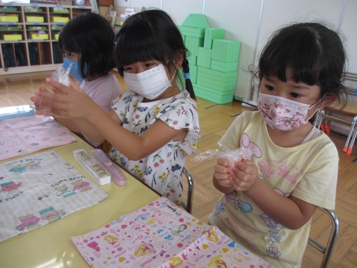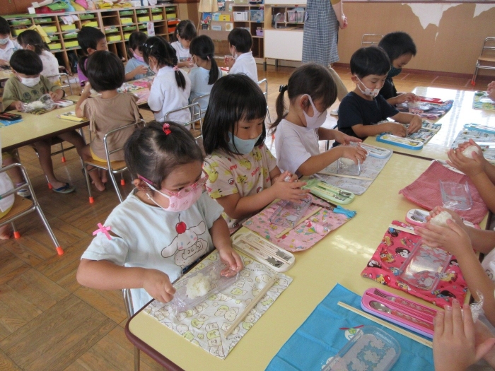 ラップにご飯をのせて形を作り、割り箸を刺して