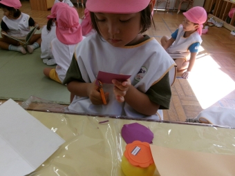 最初は保育者が線を書いたり、「お山になっているところを切ろうね。」などと、角の感覚が分かるようにしていき、丸の形になるように繰り返していきました!!