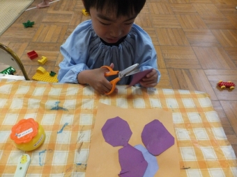 毎日1粒ずつ、紫色の四角い画用紙から角を切って丸くぶどうの形にしていきます✨