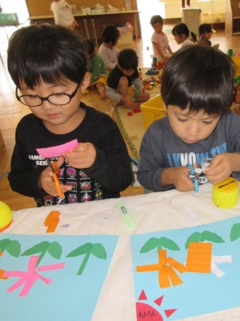 最近は、ハサミを使う製作をよくしているため、ハサミの持ち方や手を添える位置なども分かるようになり、だいぶスムーズに切ることができるようになってきました💓