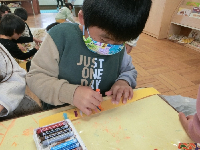 上の黄色の部分はひな人形たちの座る台座であることを伝えると、各々のイメージで楽しみながらクレヨンで色塗りをしていました😆🌈
