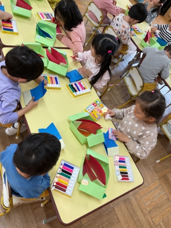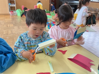 最後に、こいのぼりガーランドを作りました!しっぽをはさみで切ったり、鱗をマーカーペンで描いたり、折り紙で兜を作ったりしました✨
