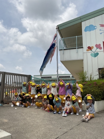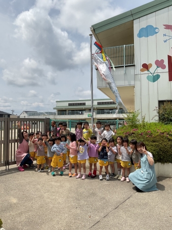 こいのぼりを捕まえようとしている子や「空を泳いでる‼︎」と嬉しそうに教えてくれる子もいました!!こいのぼりと一緒に写真も撮りました♪