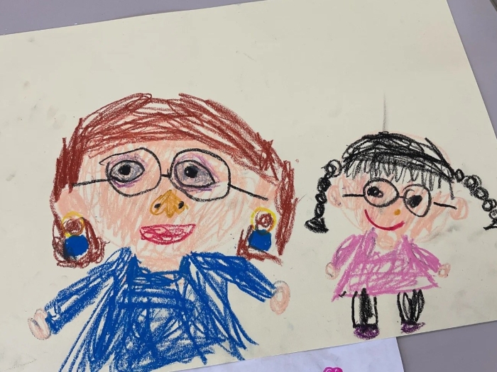描きながら「お母さんの髪の毛は茶色!」や「お父さんはメガネだよ👓」など