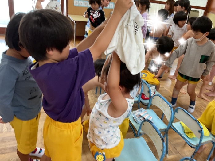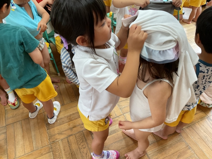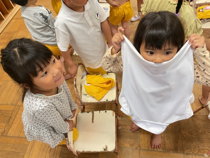 年少さんは、困ったことは年長さんに頼りながら服の裏表を直したり、