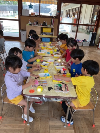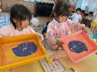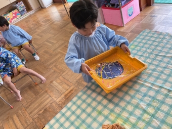 絵の具をつけたビー玉を転がして模様がついたのを見て