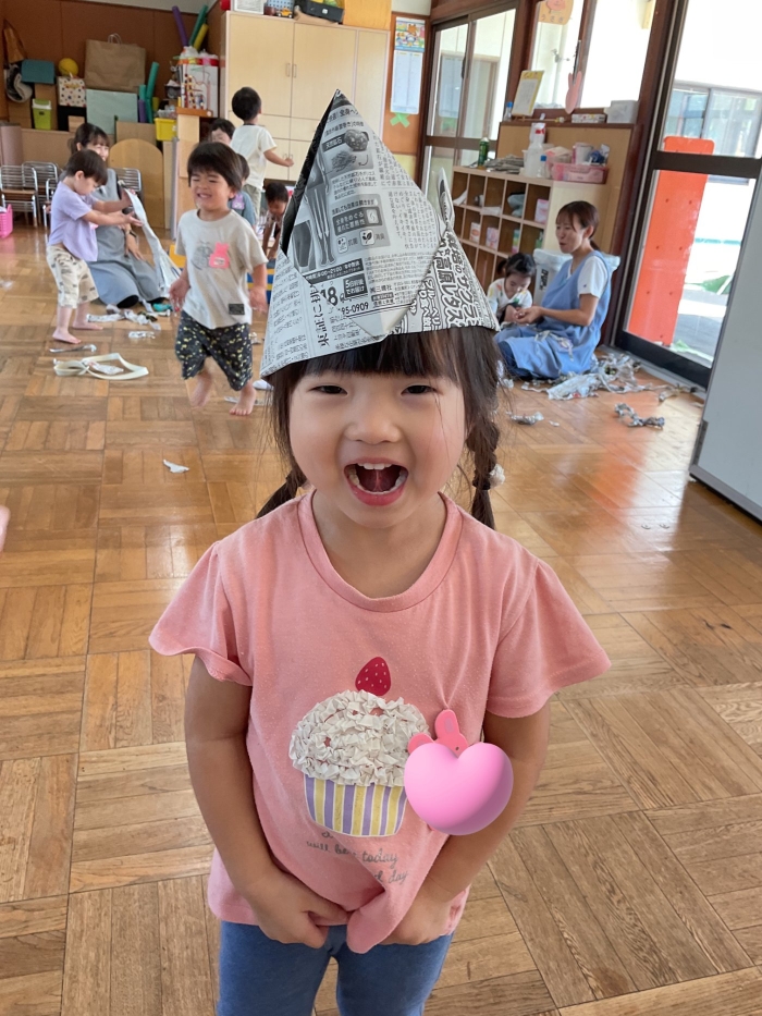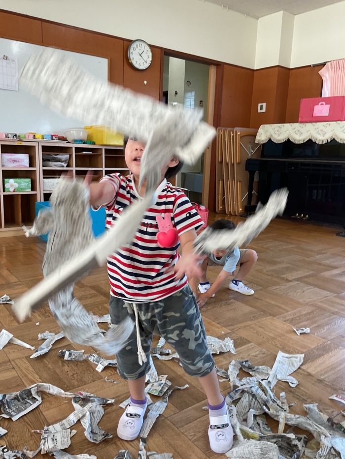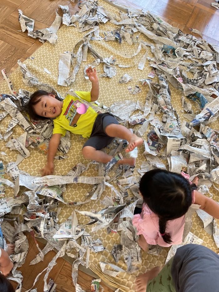 外が暑く、なかなか外遊びを十分にできていなかった為、室内で十分遊べるように新聞遊びを行いました🎶❤️
