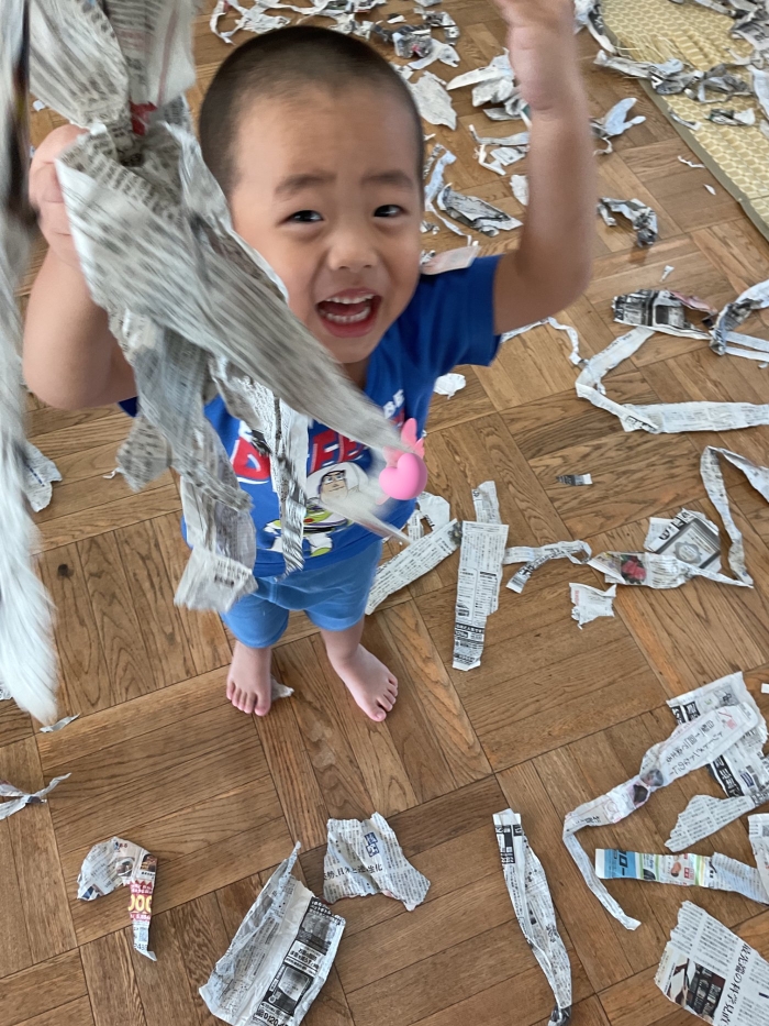 新聞をマントに見立てて遊んだり、破って遊んだり、新聞プールを作って遊びました😊💕