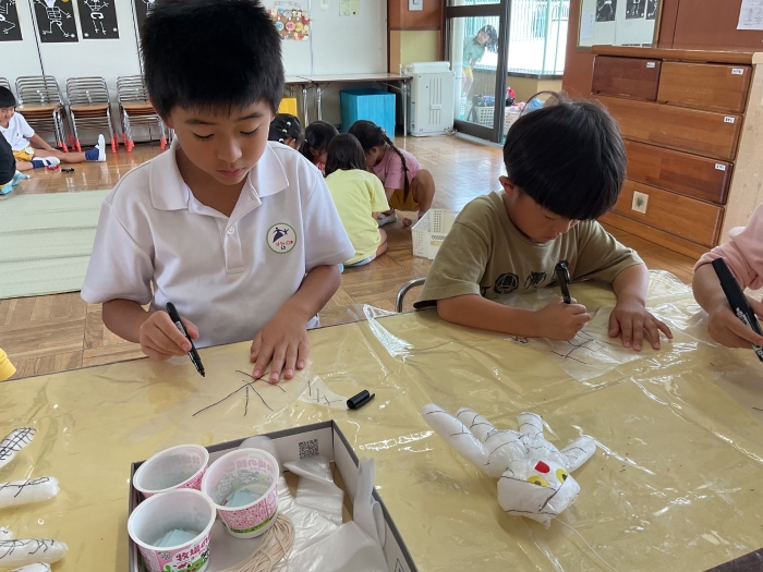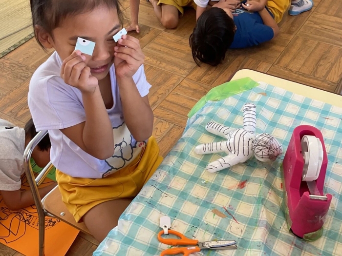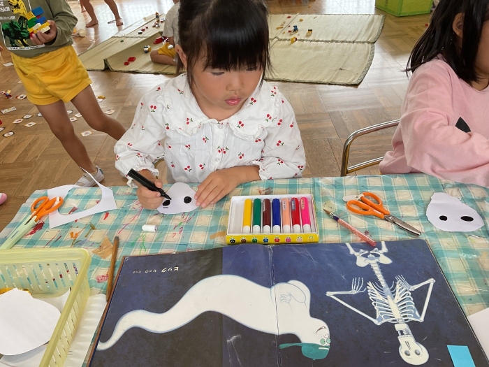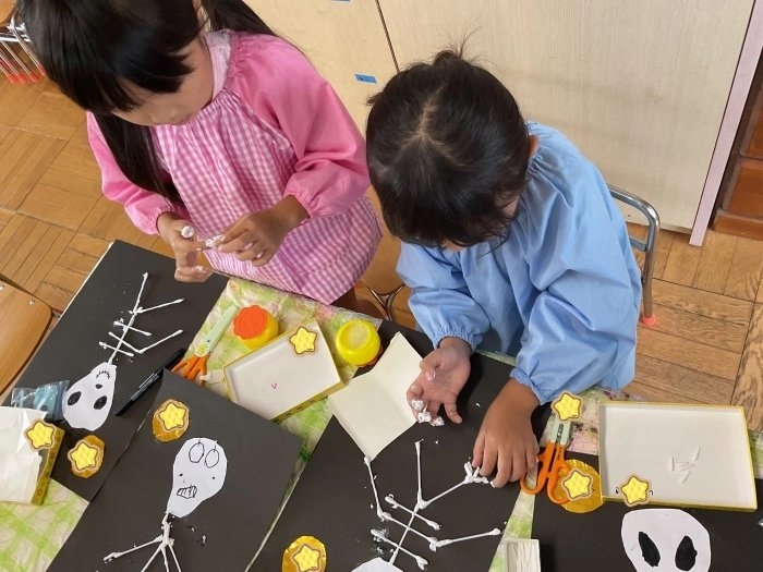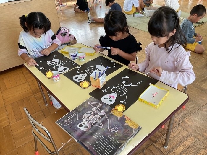 ガイコツは、顔などのパーツを画用紙で作った後、