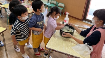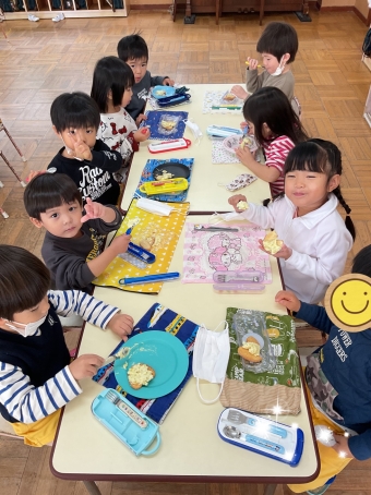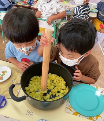 蒸したさつまいもをみんなで潰し、豆乳クリームを入れてまぜまぜ〜🌀
