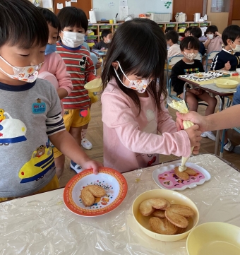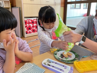 絞り袋の中にさつまいもクリームを入れ、源氏パイの上にトッピング♡