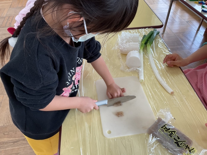 初めて切るこんにゃくなどの感触に苦戦しながらも