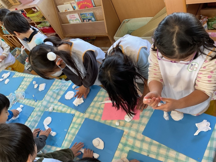 紙粘土をこねて伸ばして鏡餅とへびを作り、