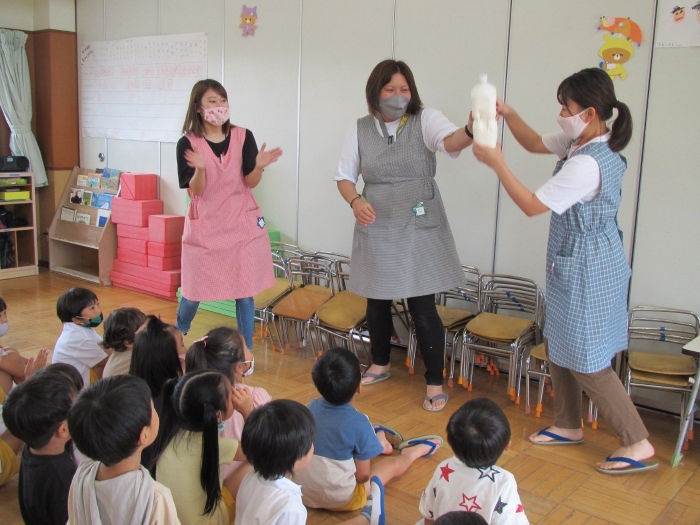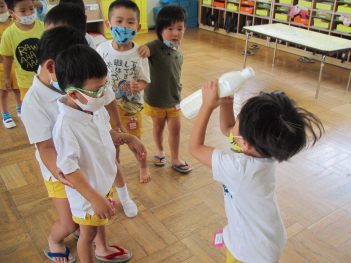 牛乳と生クリームを使ってバターを作りました!ペットボトルに材料を入れて、みんなで順番に全力シェイク!!10秒ずつ交代しながら降り続け約10分程で美味しそうなバターが出来上がりました♪
