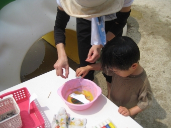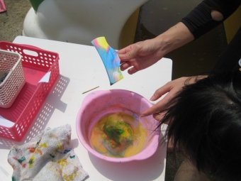 マーブリングの液をたらしてつまようじでぐるぐる♪