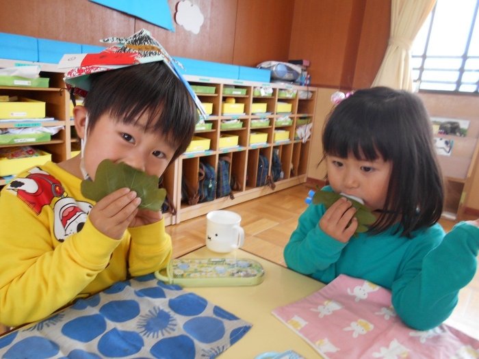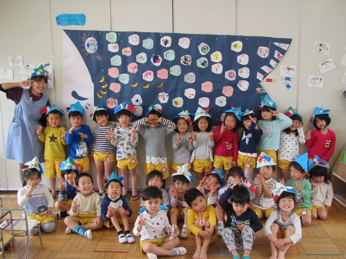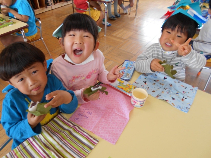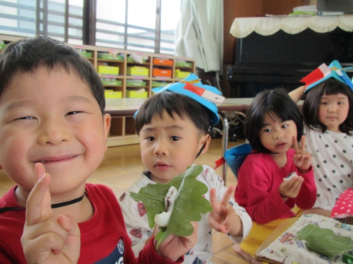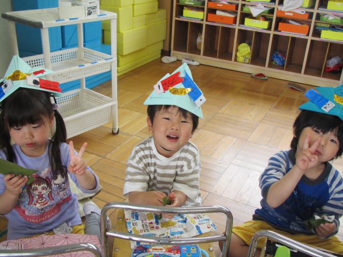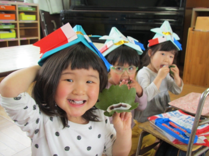 この日はみんなが作った手作りカブトを被って子どもの日の集いを行いました♪こいのぼりの歌を歌ったり、絵本を見て楽しんだ後、みんなで柏餅を食べました!「葉っぱは食べちゃいけないんだよね!」と自信たっぷりに教えてくれる子もいましたが、あんこが苦手で渋い顔をしながら食べている子もいましたよ😂