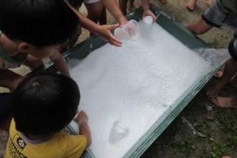 固形石鹸を削り、たらいの中に水を入れて泡立てネットで泡立てると・・・