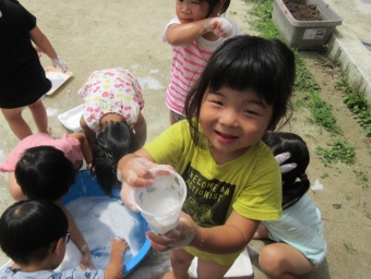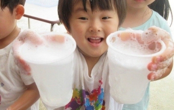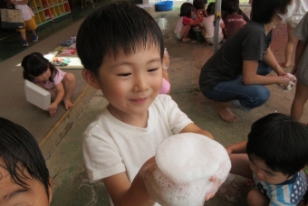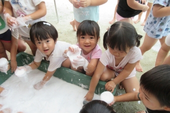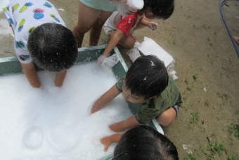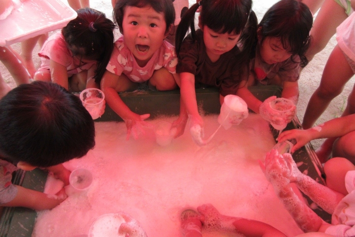 片栗粉粘土に続いて、感触あそび第2弾!みんなで泡あそびをしました☆
