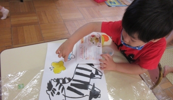 朝の支度が終わった子から、1~2枚折り紙をちぎってシマウマとちょうちょが描かれた台紙にのりで貼っていきます。