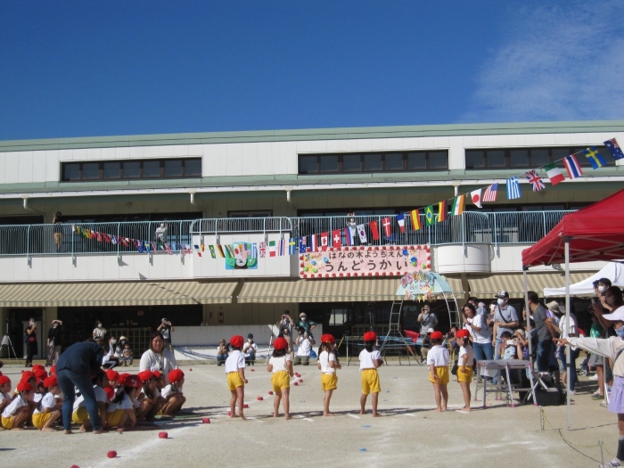 晴天に恵まれ運動会日和の中、欠席する子もおらず年中86名全員で参加することができました!