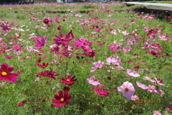 濃いピンクや薄いピンク、白色のコスモスがあり