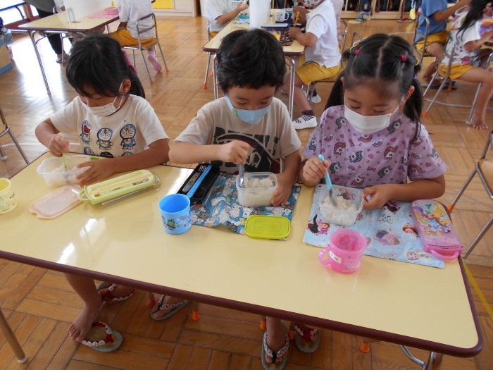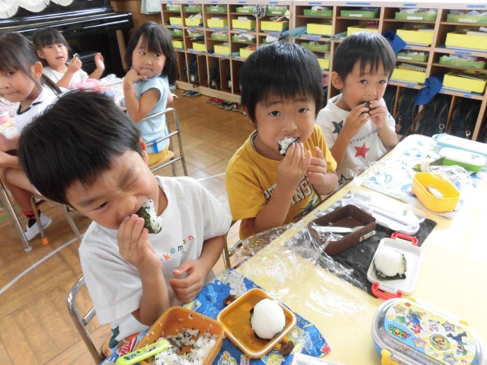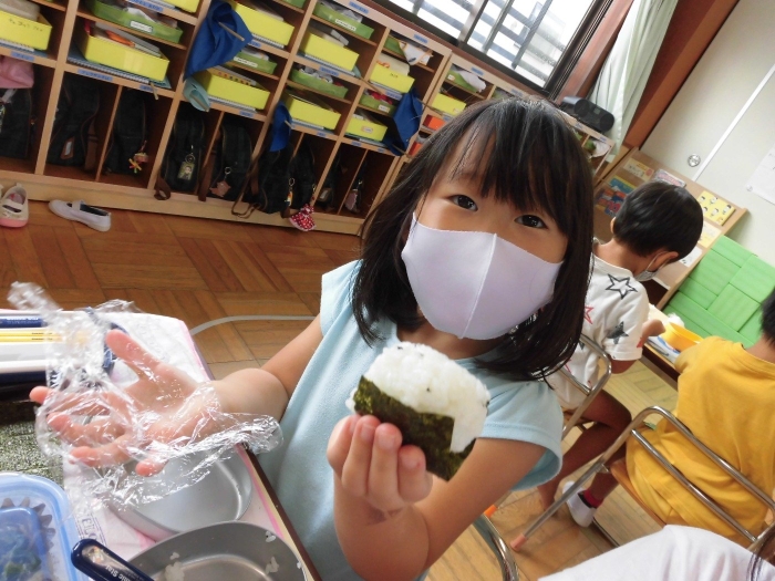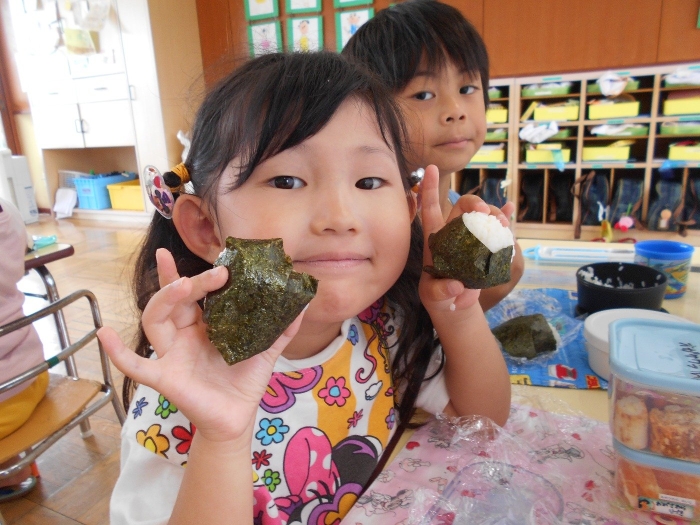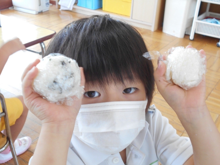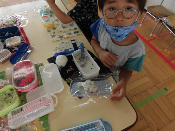お弁当の日にみんなでおにぎり作りをしました☆おうちからご飯を持って来てもらい、塩おにぎり・わかめおにぎりの2種類を自分で握りました♪給食の時は先生が握ってくれたおにぎりを美味しそうに食べている子ども達ですが、この日は自分で握ったおにぎりというだけあって一段と美味しかったようですよ♡