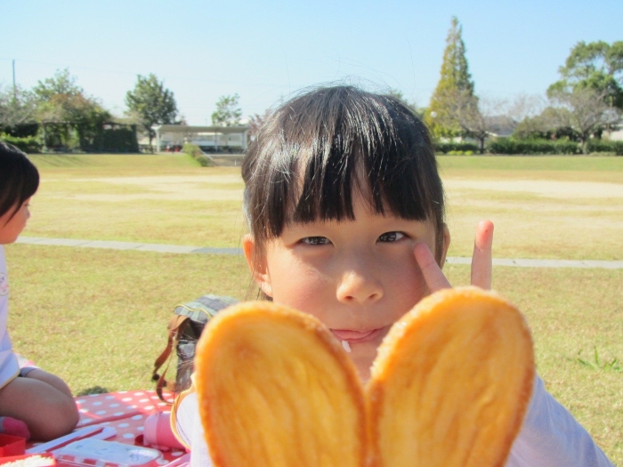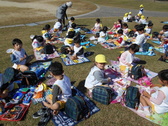 散策の後はお楽しみのお弁当タイム☆クラスごとにシートを広げてお母さんお手製のお弁当を食べました♪