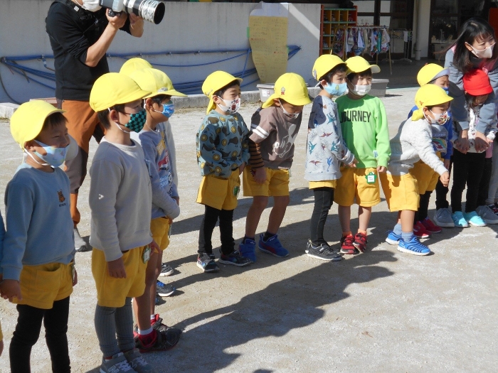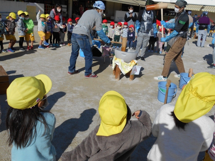 マスクをしっかり身に付けて対策を取りながらいざ出陣!!残念ながら年中さんは実際に餅つきは経験できませんでしたが、お父さんがお餅をつくのを子ども達の元気をパワーに変えて応援しました!