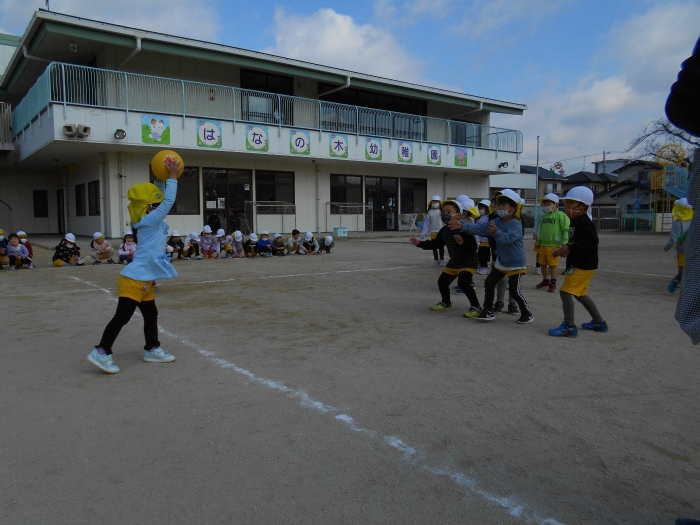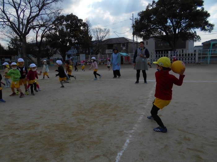 運動会の景品でもらったボール。毎日触って遊ぶうちにまりつきがたくさんできる子や、ボールキャッチができる子が少しずつ増えてきました☆そんな子ども達の姿を見て、ドッジボールに挑戦してみました!!外で年長さんがやっているのを見ている子ども達は「知ってるよ!」「ボール投げるやつでしょ!?」と自慢げに教えてくれました♪