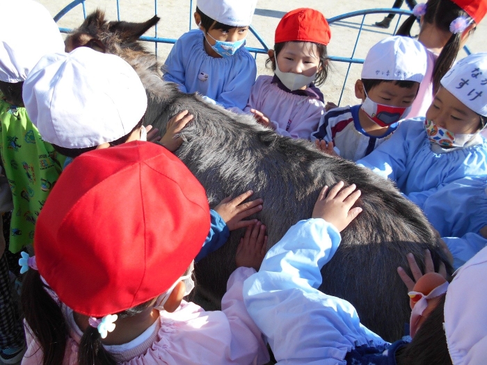 いちご動物園のお兄さんから動物の触り方、エサのあげ方を教えてもらって触れ合いスタート♪子ども達より大きなロバさんもいましたが怖がる子もほとんどおらず、積極的に動物との触れ合いを楽しんでいましたよ😄