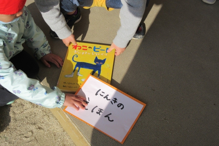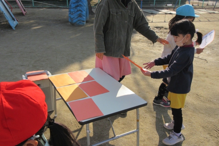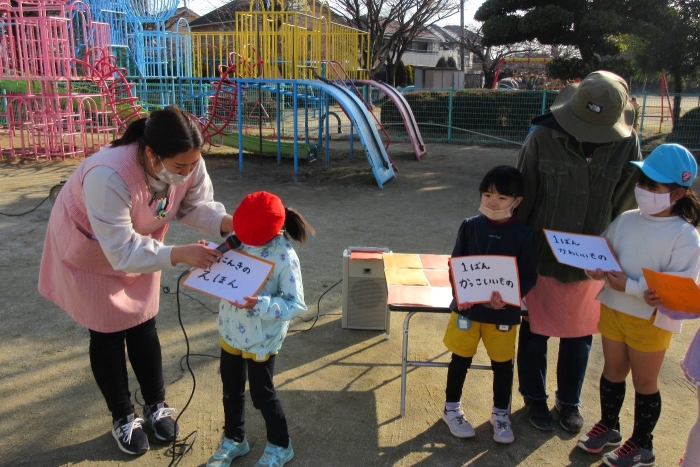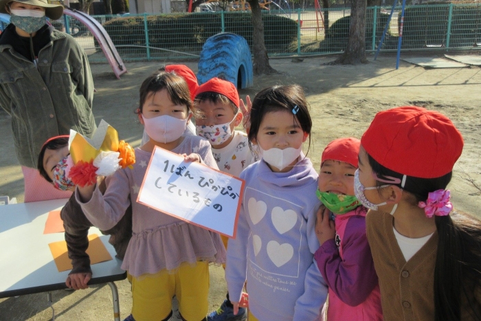 まずひとつ目のお楽しみは「借り物競争」をしました☆それぞれのグループがひとつずつお題を引き、幼稚園全体を走り回って答えになるモノを探しに行きました♪少し難しいお題もありましたが、さすがは年長さん!グループのお友だちと力を合わせてクリアすることができていましたよ☆