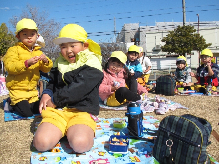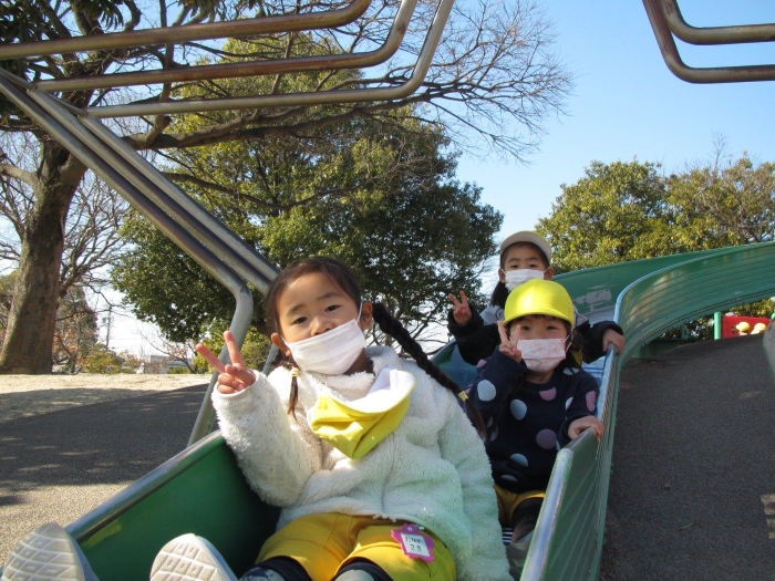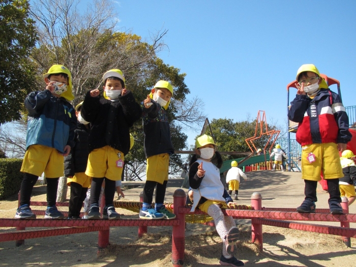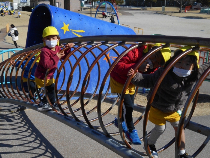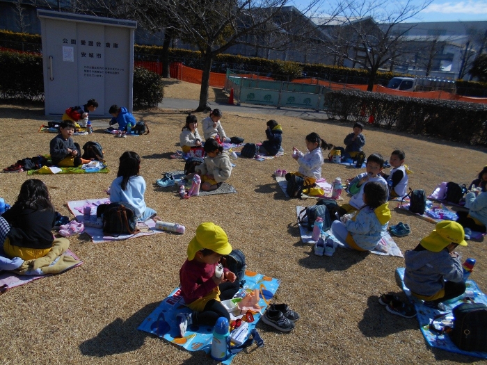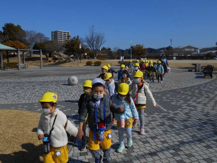 今回は安城の篠目公園まで歩いて遠足に出掛けました!今までよりも長い距離を歩かなくてはいけませんでしたが、子ども達の足取りは軽く30分程で公園に到着することができました♪寒いことを予想して上着着用で行きましたが、天気も良く先生・子ども共に「暑い~!」と言いながら歩いて行きました!