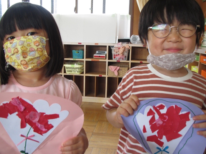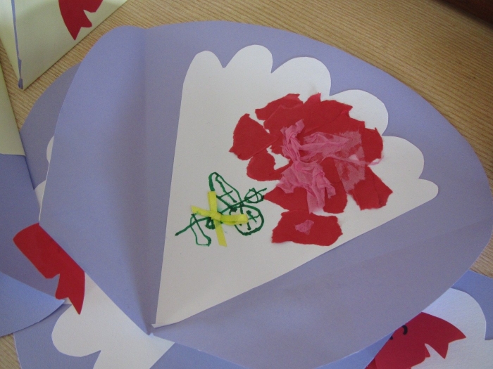 母の日のプレゼントということで……画用紙とおはな紙をちぎってカーネーションを作りました!!