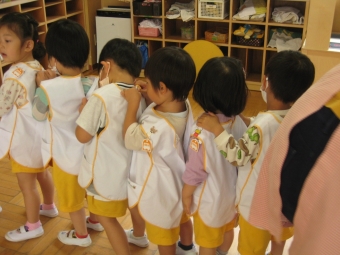 お友だちと汽車になって、前にいるお友だちのボタンを外すところからスタート☆