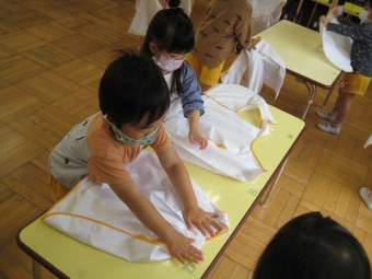 お友だちのボタンを外せたら、自分で畳むことにも挑戦しています!