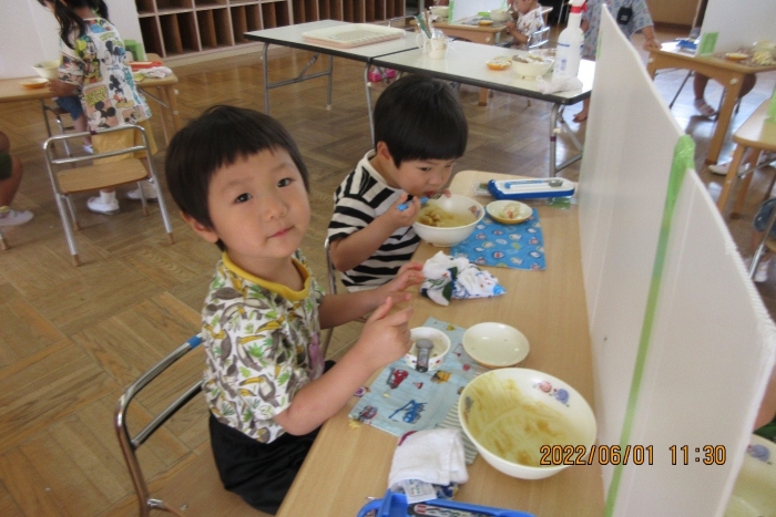 「カレー美味しいね♡」と口のまわりに茶色のひげをつけながらモリモリと食べていました😋
