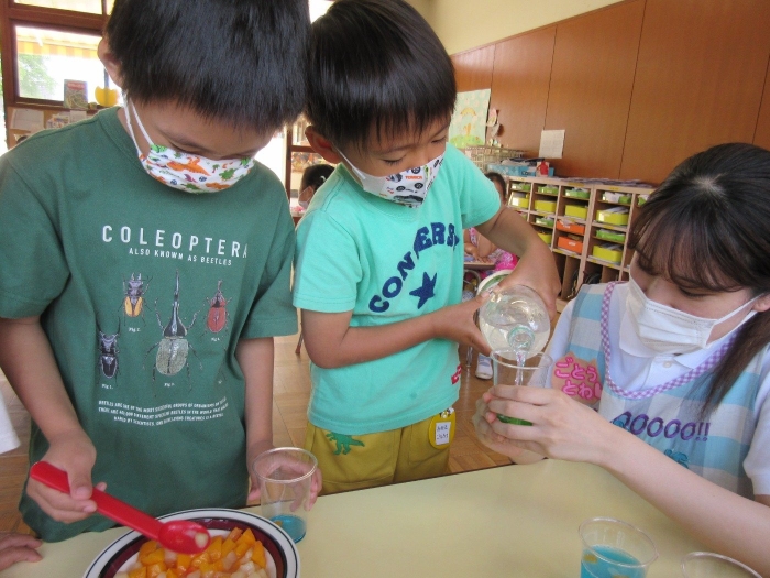 年長さんは、大きなペットボトルから自分のコップにサイダーを注ぐことにチャレンジしました!