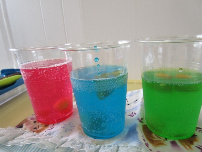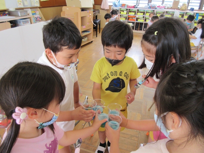 透き通った赤・青・緑のサイダーを見て「かわいい💞」「きれいだね😳」とコップの中を覗いてる姿も見られました!