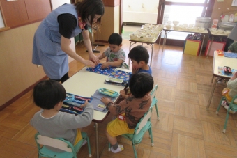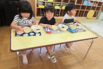 初めての給食にもかかわらず、「せんせーい!見ててね♡」と言って、お野菜をパクっと食べられる子もたくさんいました。午前中に園庭でいっぱい遊んでお腹が減っていたこともあり、おかわりをする子も!!