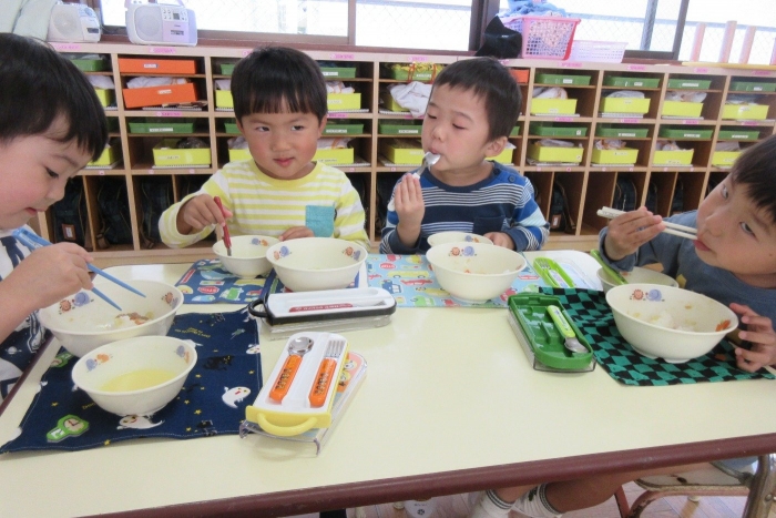 温かい給食に「おいし~い💕」と、大満足な様子でした!!お家でもお子さんのお話をいっぱい聞いてあげてくださいね!!