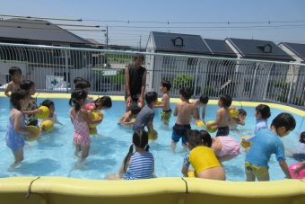 そんな中…年長さんと年中さんは、体育あそびの”きむちせんせい”とおもいきりプールでの活動を堪能しました☆
